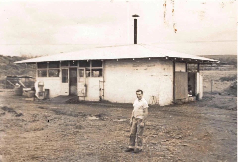 Frank and his former wife, Esther “Mimsey” Frenz (who worked as a nurse in Hilo), had three sons all born in Hilo, Hawaiʻi in the 1940’s. Their three sons, Mike, David, and Bruce Frenz all worked together to build the initial smoke house and processing room by creating the large cement blocks that took days to press and dry in the sun before they could be used. That original structure is used today as the front office where we greet our customers daily.